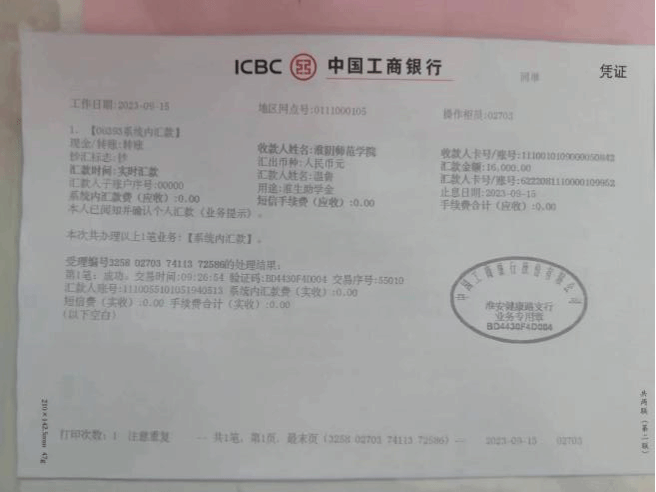近日,生科院关工委收到一笔捐款16000元。这笔捐款来自生科院关工委76岁退休教授温鲁。为了支持学校教育事业的发展,帮助家庭经济贫困、努力上进的同学顺利完成学业。生科院关工委温鲁老师设立“淮生助学金”,自2022年每年向淮师生科院资助12000元人民币,资助专业思想牢固、家庭经济困难、品学兼优的学生。生科院关工委承诺公平公正地使用这笔资金,每位学生拟资助四年,上一年度资助的学生有丁立文、马稳格、徐晨、李文秀、毛宇帆、刘雅迪等6人。