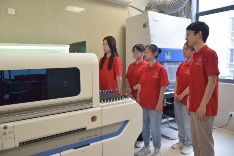 在淮安市开发区医院,实践团成员在检验科主任的带领下,与一线医护人员深入学习交流,了解了医院检验科的运作和呼吸道病原体检测的技术和流程。成员们学到了理论知识,还学习了从样本的采集、处理到检测结果的分析的常规检验流程。