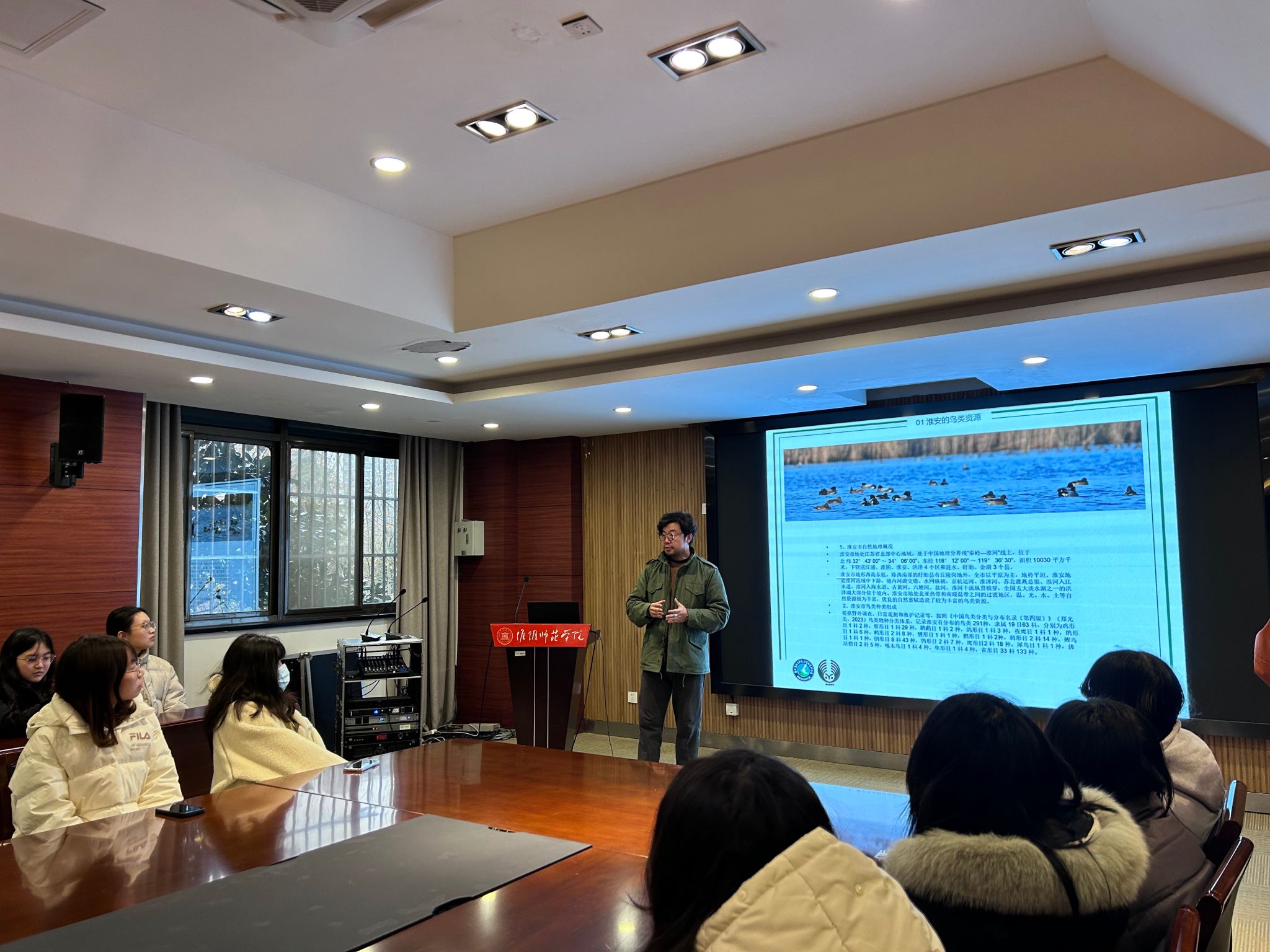 活动现场,淮安市自然资源和规划局籍荣生副局长向生科院学生捐赠了科谱图书《淮安野鸟保护与观测》。中国湿地保护协会理事、淮安湿地与野生动植物保护协会副会长余星翰作了《与鸟共生——浅谈淮安野鸟观测和保护》的科谱讲座,余老师结合自己的亲身经历,以生动活泼、幽默诙谐的科普化语言,深入浅出地为同学们讲解了淮安鸟类资源的种类、分布及淮安的观鸟“地图”,精彩的讲座在展现缤纷的野鸟世界、开阔同学们视野的同时,也向同学们发起了倡导:文明观鸟、文明拍鸟、爱心护鸟、科学救鸟,争做生态文明的先行者、野生动植物的守护者。嘉宾和同学们还现场考察了生科院生物标本馆。