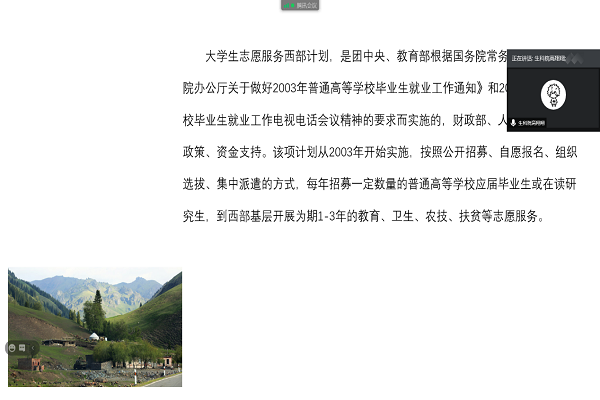 会议中,同学们回顾了自身在大学期间的志愿服务经历,如抗疫志愿服务、三下乡暑期社会实践。高老师指出,西部计划、苏北计划是重要国家战略,是应届毕业生投身社会实践、立志报效祖国的重要人生决定,希望同学们不断继承和发扬五四精神,坚定理想信念,脚踏实地奋斗。