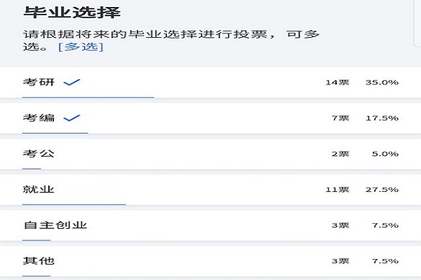 毕业去向线上调查设置的选项有:考研、考编、考公、就业、自主创业及其他等,可多选。其中,占比较高的是考研和考公,分别为35.0%和27.5%。