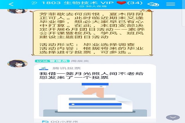 校风、学风、班风是立校之本、治学之基。为进一步规范班级学生的行为,提高学生文明素质,强化学生爱校、爱班的集体意识,引导学生树立自立、自律、自强意识,营造严谨务实、奋发向上的学习氛围和良好的学习环境,形成良好的班风学风,进而促进我班综合水平的提高,生科1803班以毕业去向为主题展开调查,于2021年6月1日开展了线上素养公开课暨“培育和践行社会主义核心价值观”主题团日活动。