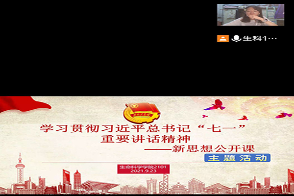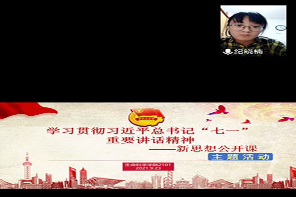 为深入学习贯彻习近平总书记“七一”重要讲话精神,2021年9月23日,生科院2101班全体师生于线上开展了此次主题团日活动。全体同学都积极参与其中。本次活动旨在引导同学们深刻领会和把握讲话的重大意义及丰富内涵,做到思想、行动与讲话精神的统一。