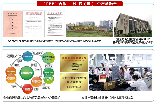 在淮安市政府直接支持下,专业依托省协同创新中心,联合淮安国家农业科技园,开创性建立了“PPP合作,校-园-企共建”的人才培养新模式,成为高校、企业与政府“PPP”合作模式的成功典范。2016年,该模式作为全省品牌专业建设典型案例被省教育厅征集推广。