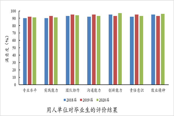 毕业生对母校课程教学、生活服务、创新创业等满意度超99%,对工作满意度85%,对自身发展的满意度超93%;用人单位对毕业生的整体满意度高于91%,尤其是对其动手操作能力、创新能力、沟通交流能力的评价较高。