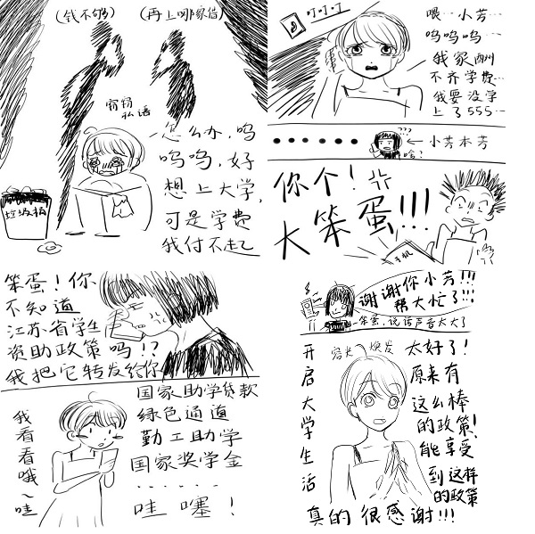 同学们积极参与,以学生资助政策以及在资助育人中发掘的典型事迹等为蓝本,通过单张或系列图画生动、形象、简洁地展示政策核心内容。