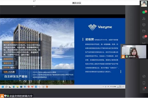 南京诺唯赞生物科技股份公司凌经理通过播放宣传片、PPT展示、线上连线交流的方式向同学们详细介绍公司的概况、软、硬件条件、发展历程、企业文化、核心技术等。最后对大家关心的招聘岗位、工作职责、任职要求、薪资待遇等方面内容进行了答疑,并与我院学生互留了联系方式。