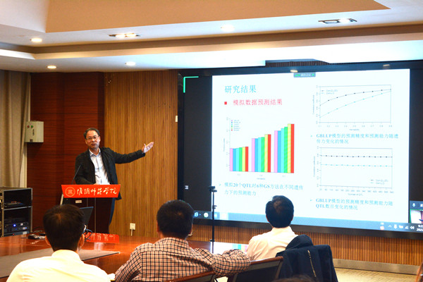 徐辰武教授从研究背景和主要研究内容2个方面对全基因组选择育种作了详细介绍。在研究内容方面,徐教授根据课题组多年来的研究积累,从全基因组选择方法的研究和应用等方面,对全基因组选择的定义、方法和模型的建立、应用前景等进行了精彩讲解,使与会人员对全基因组选择育种技术有了全面而深入的认识,为追踪国际前沿、开展相关研究奠定了基础。