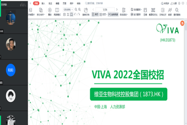 上海维亚生物科技控股集团通过PPT展示、线上连线交流的方式向同学们详细介绍公司的概况、先进的团队、获得的荣誉等。最后对大家关心的对员工的关怀以及薪资待遇等方面内容进行了答疑,并展示了入职后的一系列培训体系。